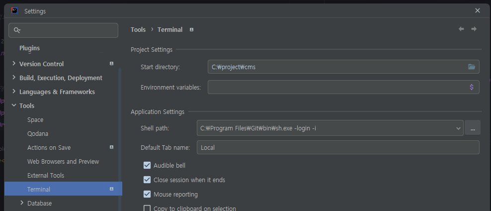 사진과 같이 터미널의 shell path를 Git파일에 들어가 bin에 위치한 sh.exe 파일을 선택해주고,