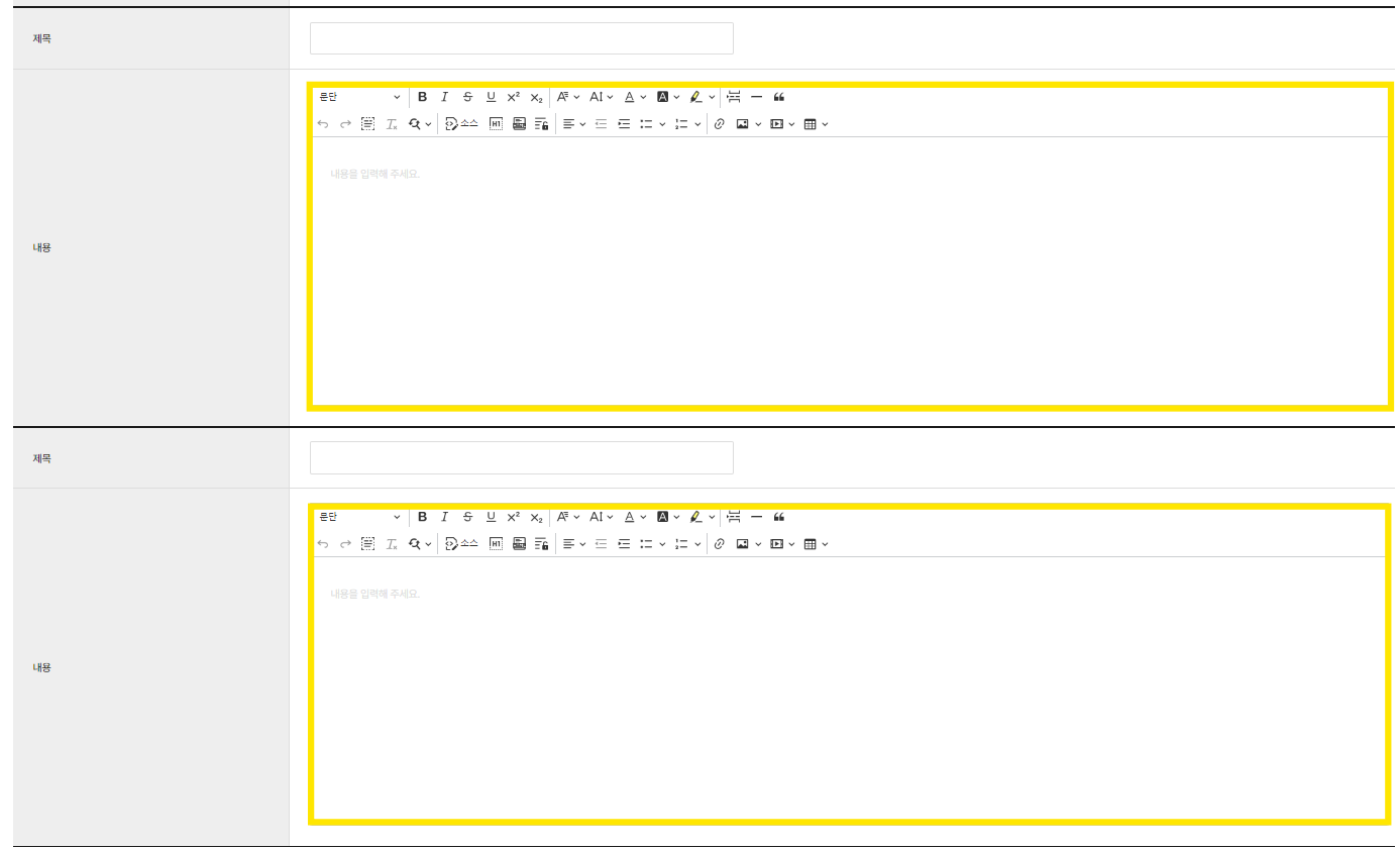 (아래 사진에는 [추가] [삭제] 버튼이 안보이지만, 요구사항에는 [추가] 버튼 클릭 시에 에디터 하나가 더 늘어나고 [삭제] 버튼을 클릭하면 에디터 하나가 제거되는 기능도 있어야 한다.)